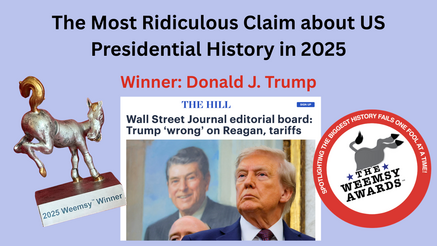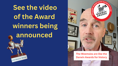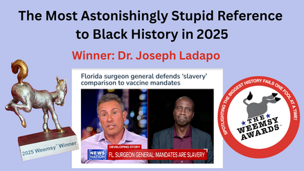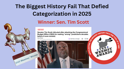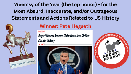 Award #1: The Weemsy of the Year for 2025 - The Person Who Said the Most Ridiculous and/or Demonstrably False Statements About U.S. History – Pete Hegseth for earning SIX nominations for f1) renaming 7 military bases for Confederate generals who fought against the US to preserve slavery for all time; 2) saying of the soldiers who carried out the infamous Wounded Knee Massacre that killed hundreds of Native Americans, “we salute their memory, we honor their service” and that they would retain their Medals of Honor; 3) declaring the US bombing of Iranian nuclear facilities “the most complex and secretive military operation in history”; 4) purging Pentagon websites of information about notable African Americans (Jackie Robinson, the Tuskegee Airmen), Native Americans (Navajo Code Talkers), women (Civil War nurses), and Asians (442nd Combat Unit); 5) ordering the return of a portrait of Confederate general Robert E. Lee (who committed treason against the US) to the library at West Point; 6) ordering the return of a Confederate monument featuring racist, proslavery imagery to Arlington National Cemetery. Details and links on all 6 nominationshere